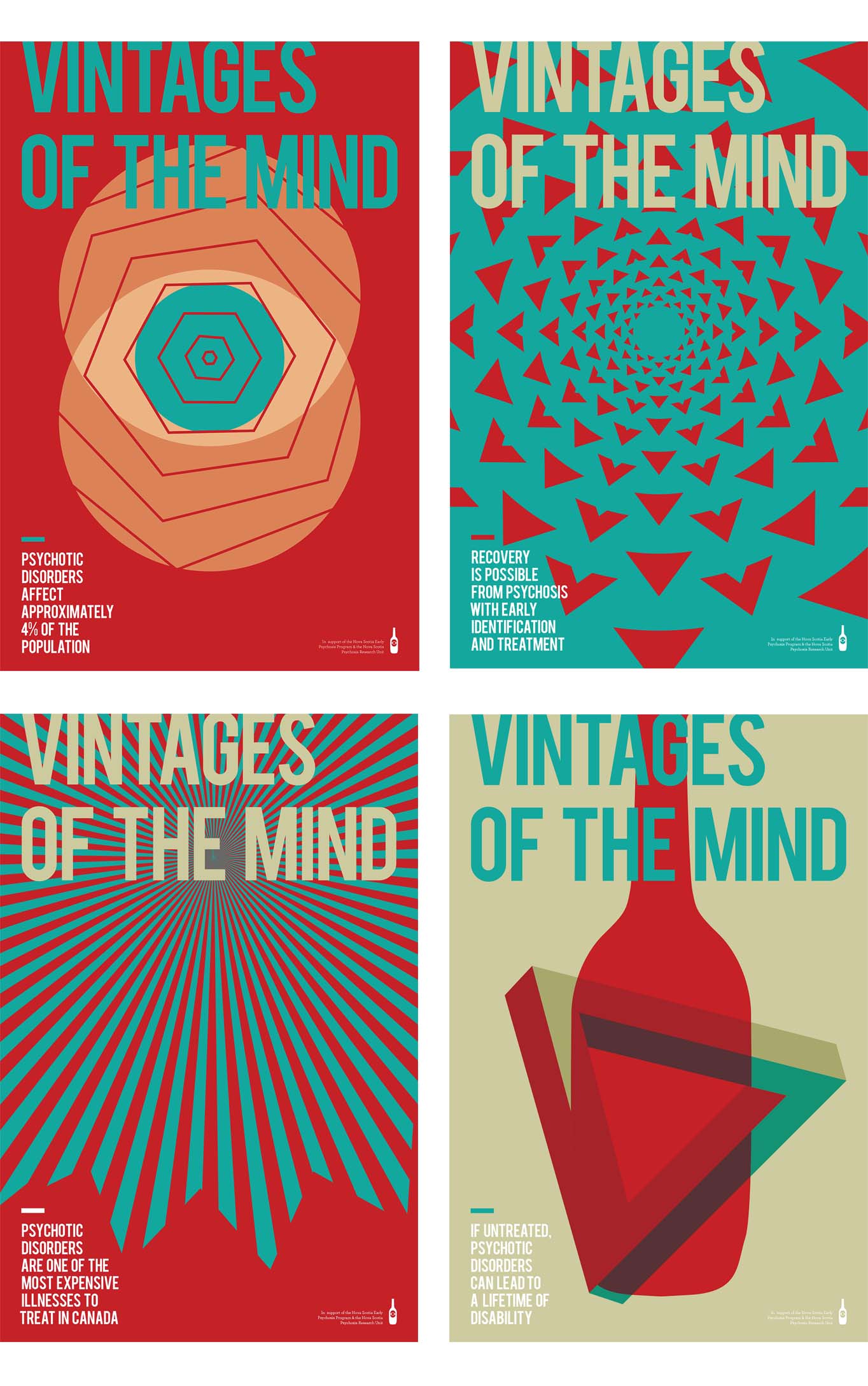I started by quickly searching for facts about psychosis, the clients website (part of Dalhousie University) had a lot of relevant information. I kept those that I found impactful to the side and thought about how psychosis could be represented visually. I used optical illusions as a metaphor for mental illness, and gave the large posters context by adding the facts I had found.